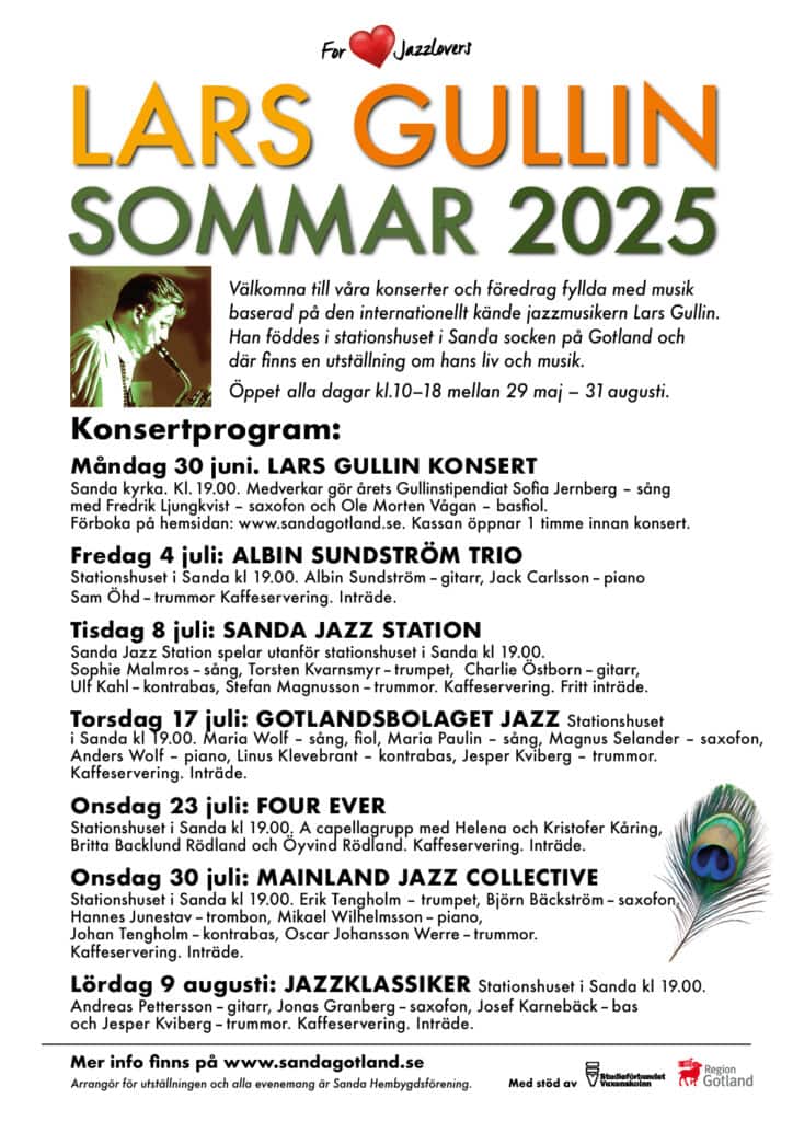 Välkomna till våra konserter och föredrag fyllda med musik baserad på den internationellt kände jazzmusikern Lars Gullin. Han föddes i stationshuset i Sanda socken på Gotland och där finns en utställning om hans liv och musik. Museet är öppet alla dagar kl.10–18 mellan 29 maj – 31 augusti.